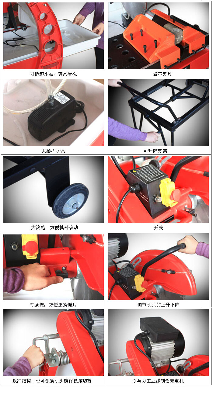 l 三马力三相电机,动力强劲| 适合湿切岩芯,能有效降低灰尘,减少对施工者的伤害l 高转速保证高效率和切割精度l 铝压铸机身和高强度焊接支架,整机更牢固,更轻巧l 电机配有过热保护装置l 带有锯片锁紧装置,更容易更换锯片l 结实的塑料水盆,便于取出清洗l 带轮子的升降支架,容易调整高度,搬运方便产品参数:电机220/380伏/50赫兹工作台大小285x500毫米额定功率2.2千瓦毛重/净重机体:60/56公斤,支架:40/37公斤空载转速2900转/分钟包装尺寸机体:90x68x84 CM刀片规格350毫米支架:97x51x22CM芯轴规格25.4毫米台/箱1 台/2箱直切岩芯长度500毫米切割岩芯深度100毫米